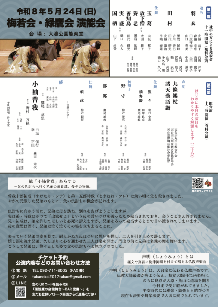 能「小袖曽我」のシテを鷹尾章弘、ワキを鷹尾雄紀が勤め、親子で曽我兄弟を演じます。また、仕舞「橋弁慶」ではシテを鷹尾維教、子方を田中佑京が勤め、こちらは孫との共演です。