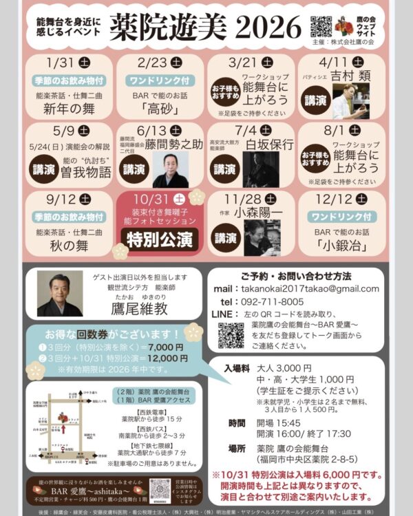 久留米・萃香園ホテルにて、夜桜能を開催いたします。 本公演は今回で21回目を迎え、毎年多くの皆様よりご好評をいただいており、2026年も開催する運びとなりました。 桜が見頃を迎える日本庭園で舞を、ホテ…