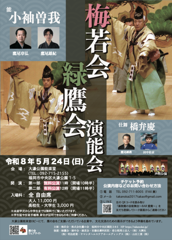 毎年開催している「梅若会・緑鷹会 演能会」。今年は5月24日(日)に行います。 能「小袖曽我」のシテを鷹尾章弘、ワキを鷹尾雄紀が勤め、親子で曽我兄弟を演じます。また、仕舞「橋弁慶」ではシテを鷹尾維教、…